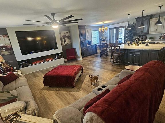 The main level offers 2 bedrooms and 1.5 baths, LVT flooring, custom lighting, smart-home upgrades, leathered marble countertops, and a striking Modern Flames electric fireplace. The primary suite includes a huge walk-in closet and a luxury tiled shower.