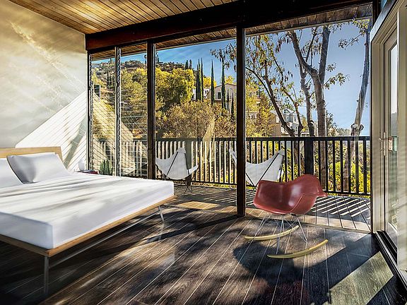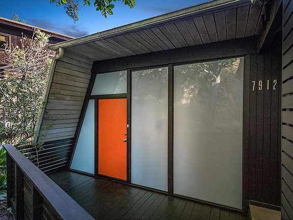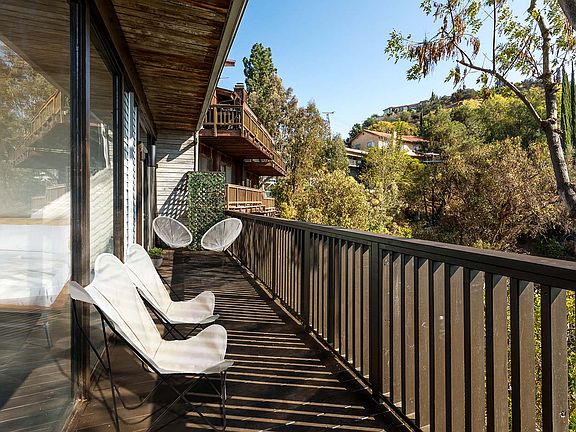 This reimagined residence has been given a stunning designer renovation while preserving the essence of iconic modernists like Richard Neutra, Harry Gesner, and the Case Study homes. A dramatic frosted-glass entry leads into a spacious open-concept living area. The angled living room wall is wrapped in tongue-and-groove planks that rise into soaring ceilings, setting the stage for both warmth and drama. Post-and-beam details and walls of glass stretch the length of the south-facing home, opening every room to a generous deck with sweeping views of Laurel Canyon. Light floods in throughout the day, and from your perch in the trees you can watch deer, coyote, and other wildlife pass by; all while being just minutes from the Sunset Strip, Studio City, and the major studios. The renovation includes updated flooring, new front and rear decks, Nest-controlled HVAC, upgraded electrical and plumbing, lighting, tankless water heater, and Milgard sliding glass doors. The chef's European-inspired kitchen and skylit bath feature custom cabinetry, quartz counters, Carrara marble mosaic tile, and designer fixtures, paired with top-tier stainless steel LG appliances including a gas range, vented microwave, dishwasher, refrigerator, washer, and dryer. The freestanding wood-burning fireplace is accented with glass tile, while original cone light fixtures and louvered windows highlight the authentic midcentury character. With its blend of architectural pedigree, thoughtful modern upgrades, and an unbeatable setting, this Hollywood Hills treehouse is a rare opportunity for a buyer with an eye for design. Weekly gardener included.
