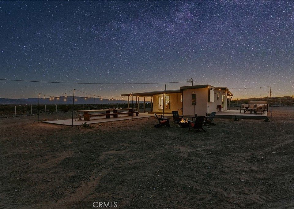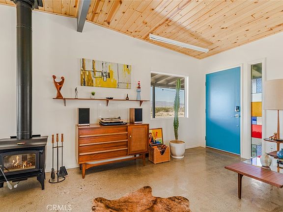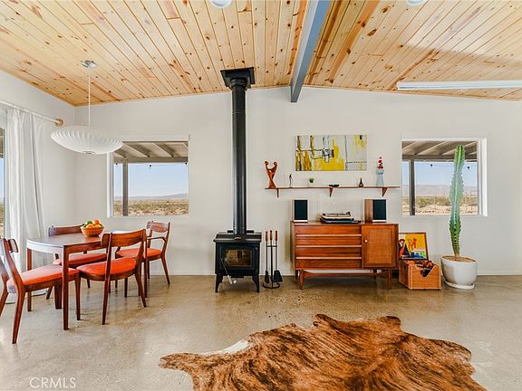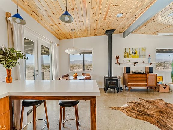 Experience the magic of the Mojave at Horizon Haven, a truly unique desert retreat. You'll feel the peace of being off-the-grid on five private acres of unobstructed 360 degree mountain views, surrounded by acres of undeveloped government land, while maintaining the convenience of being just 15 min from the North Entrance of Joshua Tree National Park, grocery stores, and restaurants. This authentic 1959 mid-century modern cabin has been lovingly restored and remodeled with modern conveniences while preserving its timeless charm. Whether you're star-gazing in the hot tub, watching a movie under the stars, or enjoying an al fresco dinner with friends, you'll feel completely immersed in the serenity of the high desert. The home features one bedroom with a queen memory foam mattress, a stylish bathroom with a walk-in rain shower, and a bright, open living room with large windows that flood the space with natural light and offer panoramic views. Tasteful upgrades include custom tongue-and-groove ceilings, wood stove for cozy ambiance, and ductless mini-split AC/heat for year-round comfort. The fully equipped kitchen offers a vintage fridge, modern appliances, and dining for up to six. Outdoors, enjoy a 4-person jacuzzi, shower under the open sky, gather around the fire pit, or lounge with a film on the outdoor projector. The fenced backyard offers peace of mind for pets, and a striking mural backdrop makes for perfect photo ops. Additional features include a washer/dryer in a private utility room that doubles as an office, a storage container, and the potential to split the 5-acre lot for future development (buyer to verify). Sold furnished with a curated blend of rare Danish modern and contemporary pieces, Horizon Haven is a turnkey vacation rental, an inspiring second home, or a tranquil primary residence. This desert time capsule is a rare opportunity to own a slice of high desert paradise. Immaculate and ready to enjoy—come see the magic for yourself!