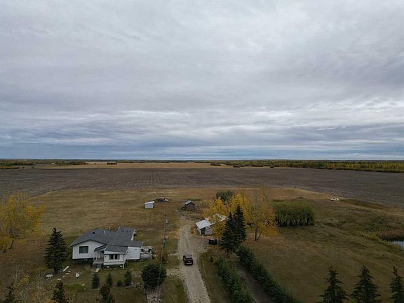 This great acreage features 10.13 aces, surrounded by fields, but with beautiful trees. It boasts 30 x 25 garage with root cellar in the lean to. There is a water softener in the root cellar. The garage has radiant heat, 220 power, sliding doors and 13.25 ft ceilings. The yard features a horse shelter and small barn that is being used as a shed right now. There is a fenced dog run as well. There are also 2 dugouts, but municipal water runs right by the house. The home is an older mobile that has had many upgrades including new furnace, shingles, hot water tank, sump, septic pump, electrical and panel, windows, insulation and counters .... and is attached to an addition with a basement. There is also a porch addition. The kitchen is large and boasts many counters and is open to the dining area. There are 3 family rooms, one on each lever, 3 bedrooms, and office, 2.5 bathrooms This is a great property and is ready for new owners. Appliances may not be the ones shown