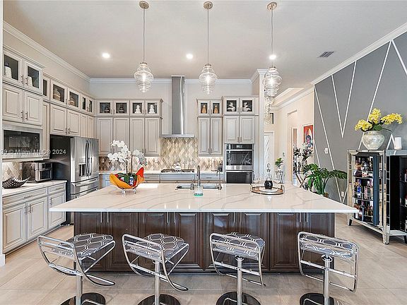 PRICED TO SELL prestigious Parkland home. This 3/3.5 waterfront home boasts over 2,600 sqft of luxury, with $200k in designer updates and options—from exquisite window treatments to dazzling crystal chandeliers and captivating wall installations. The gourmet kitchen features an extended island, double-stacked cabinets, and GE Profile appliances, complemented by a custom pantry. Open floor plan, 12-foot ceilings with elegant moldings, a triple split bedroom layout. The primary bedroom includes a spacious walk-in closet, double vanities, and a walk-in shower. Step outside to an entertainer's paradise, with an extended lanai, custom pavers, lighting, and breathtaking sunsets over the water. Enjoy the gated community with resort-style amenities, pickleball, pool, clubs, lounge, cafe, and more.