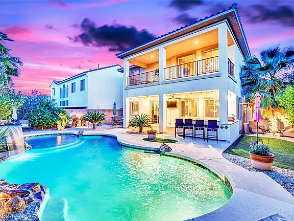 This exquisite residence is nestled within the prestigious community of Mountain's Edge, boasting a guard-gated entrance. The home radiates ownership pride, highlighted by stylish designer flooring throughout the 1st floor. It opens into an elegant den & formal dining room. The chef's kitchen is a delight with granite countertops, custom cabinetry, stainless steel appliances, and a large island. The spacious living room features a cozy fireplace and a chic wood accent wall. The 1st floor also includes a bedroom and a full bathroom. Upstairs, the expansive primary bedroom offers a private balcony with backyard views. The luxurious primary bathroom includes dual vanities, a separate shower, and a bathtub. Additionally, three more bedrooms and a laundry room complete the upper level. The backyard transforms into a private oasis, featuring a PebbleTec pool, a covered patio, and a built-in outdoor kitchen, ideal for entertaining. Conveniently located near parks, shopping, and entertainment.