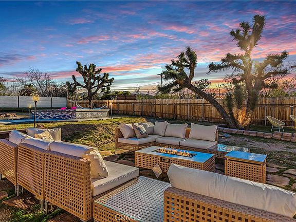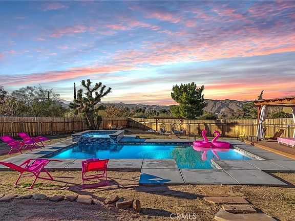 Discover the perfect blend of desert charm and modern comfort in this beautifully updated three-bedroom, two-bath home situated on a generous half-acre corner lot in Yucca Valley’s desirable Storey Park community. Designed with indoor–outdoor living in mind, this home features an inviting open layout with abundant natural light, neutral finishes, and a seamless flow for relaxing or entertaining. The chef-friendly kitchen offers crisp white cabinetry, granite countertops, and stainless steel appliances, while the cozy living area is anchored by a classic fireplace. Step outside to your own private oasis—complete with a sparkling 2022 pool, elevated spa, and a spacious baja shelf perfect for lounging. The backyard is fully fenced and thoughtfully designed with multiple spaces to unwind, including a covered patio ideal for dining, a wooden deck with a stylish cabana for shaded relaxation, and additional seating areas surrounded by Joshua Trees and mountain views. This layout makes it an excellent option for a primary residence, vacation retreat, or short-term rental investment (buyer to verify). Additional upgrades include owned solar (approx. 3 years old), dual-pane windows, central heating and air, a newer evaporative cooler, and a dedicated dog run. Just minutes from Joshua Tree National Park, local shops, dining, schools, and outdoor recreation, this property offers the perfect mix of tranquility, convenience, and desert-lifestyle living.