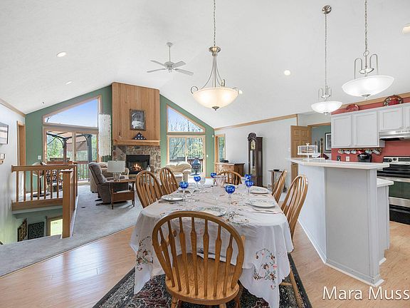 Enjoy stunning views from your living room in this 4+ bedroom, 3 full bath walkouthome across from the North County Trail and Thornapple River Sitting on over 6acres, this home is an oasis with so many amenities. Master Ensuite has skylights inthe bath area with a soaker tub and double sinks; the large bedroom has sliders to thedeck that spans the entire home. The kitchen has Corian Countertops and a largeisland. The living room with vaulted ceilings and large windows with a stone fireplacein the center of them is a wonderful place to gather & relax. On the other end of thehome you will find two more bedrooms and a full bath. Main floor laundry is a bonus.Downstairs you will find another bedroom and full bath. There is a large living roomarea and lots of built-ins.