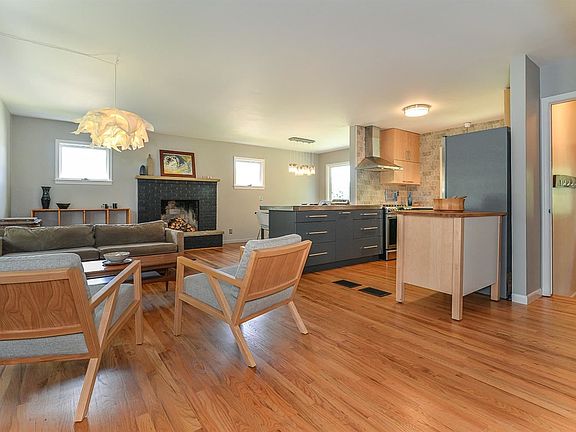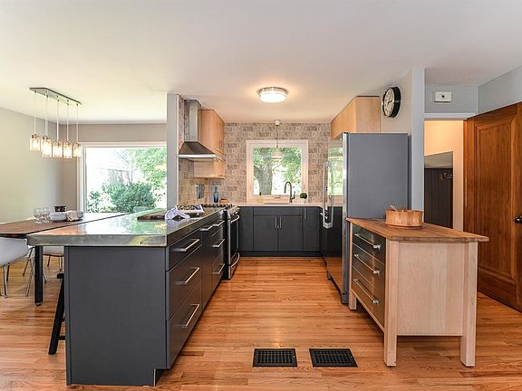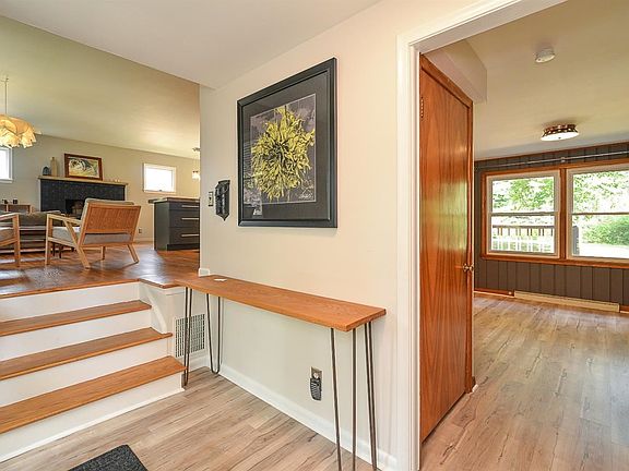 Stunning Midcentury Modern gem on private wooded 1 acre lot. This retro beauty has been updated in all the right ways, while maintaining its original appeal. Sought after open floor plan and gourmet kitchen designed by professional chefs, make this home a delight for entertaining. The sellers spared no expense with custom cabinetry, Stainless Steel appliances, quartz counter tops and high end tile. Striking fireplace in main family room and second fireplace in partially finished basement. Entry level private master suite with luxury soaking tub and separate shower and walk-in closet. Gleaming original hardwood floors have been restored. Recent updates include Wallside Windows 2018, new septic field 2017, new water heater, newer roof on home and garage, city water. 3 bedrooms on the upper level with 1 full bath and 1 half bath, en suite. Bonus family/flex room in the rear with views of the deck and lush surroundings. 2.5 car garage with workshop space completes the package.