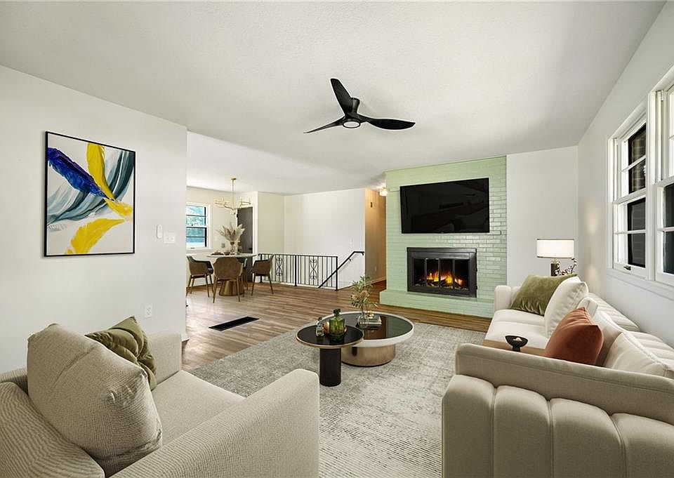 HUGE price reduction!! You don’t want to miss this beautiful raised brick ranch tucked away in a quiet, mature neighborhood just ten minutes from The Legends and all the shopping, dining, and entertainment you could want. Step inside and you’ll appreciate the open-concept design that blends the living, dining, and kitchen spaces together. The fully updated kitchen features new soft-close natural oak cabinetry, granite countertops, a beautifully tiled backsplash, and brand-new stainless steel appliances. An oversized island adds bar-top seating and extra prep space while allowing you to stay connected with the living room. The formal dining area provides a more traditional option for meals and gatherings. The living room is warm and inviting, highlighted by a gorgeous brick fireplace that serves as a perfect focal point. The main level continues with all-new LVP flooring, fresh interior paint, new hardware, and updated light fixtures throughout. The hallway bath has been beautifully renovated with a new tub, tiled shower, vanity, shelving, and modern finishes. Bedrooms are nicely sized, and the primary suite stands out with a fully updated bathroom offering a tiled shower, tub, new vanity, and thoughtful storage. Downstairs, the lower level provides a spacious family room with a second fireplace and an eclectic accent wall, along with a fourth bedroom and a third full bathroom that includes a stand-alone shower and newer vanity. The oversized two-car garage gives plenty of space for parking and storage, and the well-maintained mechanicals give peace of mind. Outside, the fully fenced backyard offers privacy and plenty of space for activities or entertaining, complete with a large concrete patio. This home is clean, updated, and ready for its new owners to move right in.