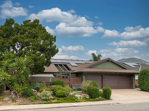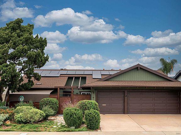 Meticulous pride of homeownership awaits you! Move in this 4br, 2ba home and make your personal touches on your timeline. Solar is paid off, and speaking of energy saving, the warm exterior tones are energy efficient coated. Seller has provided information on the upgrades throughout, including windows, doors, flooring, appliances, and more. From the private front courtyard to the resort-style, heated & remodeled, pool, this property offers peace and tranquility in one of San Diego's best neighborhoods.Primary suite has 2 separated vanities and closets as well as sliders to the pool. The laundry room and 3-car garage provide ample storage. Vaulted ceilings in the front living room and dining provide a beautiful light and brightness. The open floor plan of kitchen and living room offer a space for togetherness, or coziness with the help of the gas fireplace. Location is close to popular hiking trails, golf, and Lake Murray recreation area. Enjoy Cowles Mountain View from the backyard.