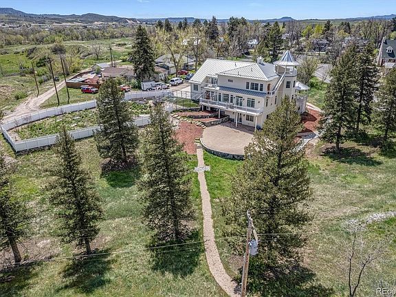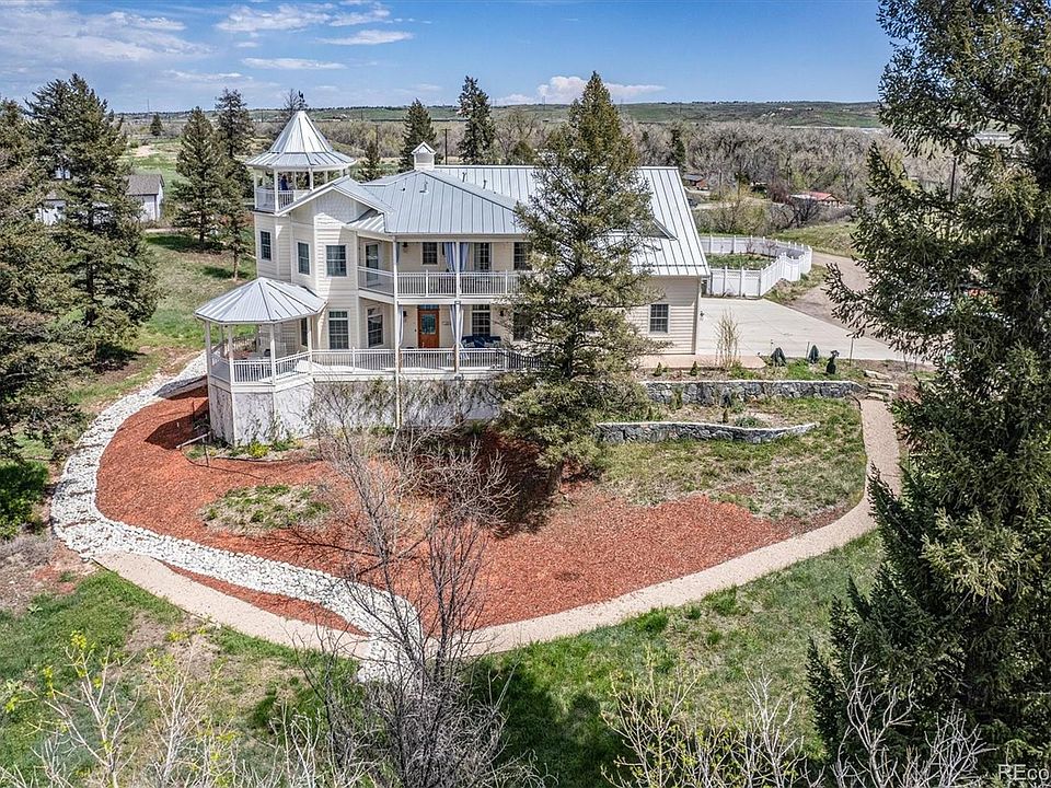 Stunning home in historic Louviers! Come home to a tranquil and slower paced lifestyle. Amazing community. Beautiful setting on over 1.5 acres. Enjoy the surrounding parks and open space with wildlife abound. Inviting entry from dramatic walkaround covered front porch. High end flooring throughout. An abundance of windows on every level allows natural light to pour in. Built in 2018 featuring old world charm with all the modern day comforts and amenities. Exquisite attention to every detail. Light, bright and airy. Wonderful, open floor plan. Incredible chefs' kitchen featuring multiple islands, high end cabinets, counters and appliances. Entertaining is a breeze with the kitchen adjacent to the great room with gorgeous fireplace. Main floor study with French doors and adjoining full bath. Elegant primary suite with separate retreat and spa inspired luxurious primary bath. Huge walk-in closet. Private access to staircase that leads you to a roof level "gazebo" with spectacular views for miles. Ideal for morning coffee or enjoying a sunset. Secluded guest suite with living room, kitchen, study, full bath and bedroom. Perfect for guests, kids or in-laws. Beautifully finished walkout basement including bedroom, bath, family room, wet bar and plenty of storage. 3-car attached. But it doesn't end there. The old Louviers firehouse was converted into a 1964 square foot garage with heating, half bath and multiple entry/exit doors. Ideal for the car collector, hobby enthusiast or almost anything you can think of. High speed internet. This is a special home from all its outdoor living space to inspiring architectural design and high end finishes.