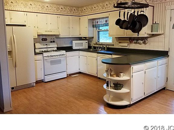 Nice 3BR/2BA brick ranch home located in a scenic wooded area. (4th BR is used for laundry/pantry room). And No stairs! Newer A/C. Fenced 3.5 acres with a big 3-car garage with sunroom, could be utilized as an apartment (has own water & sewer hookup). Includes 2 additional outbuildings on property—one is a 24’ x 32’ workshop/mechanics garage. Secluded in the country - yet still close to town!