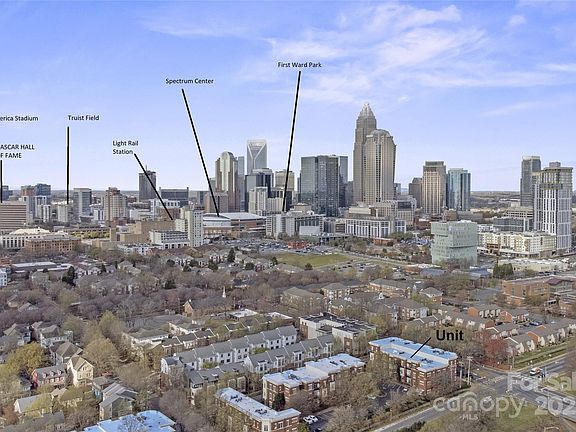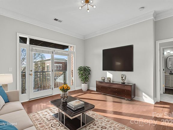 Stunning top floor penthouse unit with soaring 10' ceilings, fresh interior paint, new carpet, and numerous other updates throughout. Beautiful two bedroom, two full bathroom unit featuring a desirable split bedroom layout and abundant natural light throughout. Warm and inviting open layout highlighted by pre-finished hardwood floors, insulated doors and windows, two inch blinds, neutral paint, recessed lighting, upgraded light fixtures, custom built in shelves/workspace, and relaxing covered balcony. The attractive renovated kitchen boasts a timeless white on white decor, granite countertops, custom tile backsplash and accent wall, kitchen island with breakfast bar, and upgraded cabinet hardware. The spacious primary bedroom offers brand new carpet, charming Juliet balcony, private ensuite bathroom with dual vanities, upgraded LVP flooring, soaking garden tub, and large walk in closet. Premier First Ward location offering a Downtown Charlotte lifestyle right outside your front door.