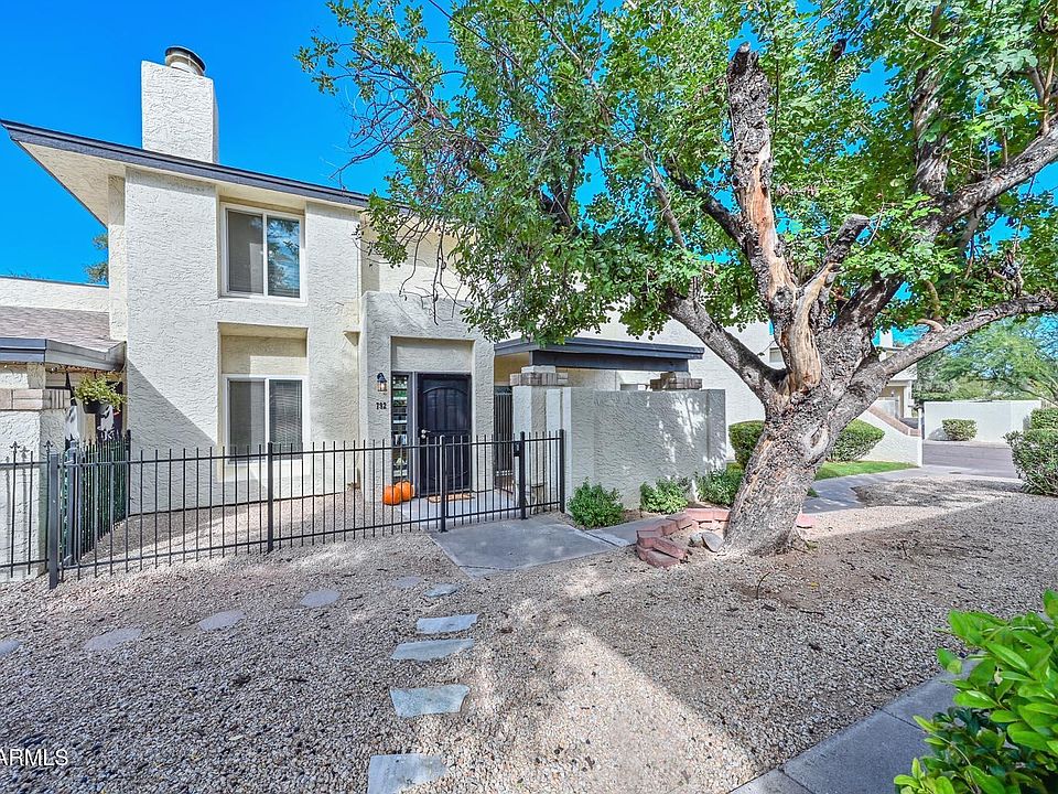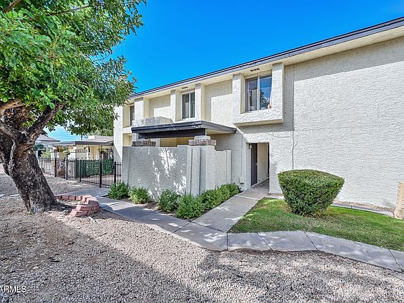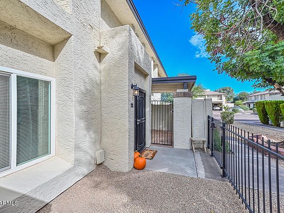 Welcome to this beautifully updated two-story townhouse in the Moon Valley area of North Phoenix! This 2-bed, 1.5-bath home features newer flooring, clean paint, completely remodeled kitchen and baths and all new windows. The modern kitchen has granite counters, all stainless steel appliances, and pantry storage. The airy living space includes a cozy wood-burning fireplace and opens to a private courtyard perfect for relaxing with a morning coffee or evening beverage. Both bathrooms are immaculate with granite and classy fixtures. The upstairs bathroom has a huge shower appointed with barn door style glass doors and gorgeous tile. For parking there is a shared carport and another assigned spot immediately in front of the home. In the carport is the laundry room with Samsung full size stack stacked washer & dryer and lots of extra shelving. Enjoy a quiet community with a swimming pool, all set back from the main streets for extra privacy and lots of rabbits and quail. This is an ideal property for first-time buyers or a low-maintenance second home.