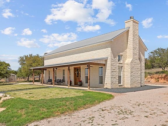 HILLTOP HORIZONS – This stunning custom home, perched on a hill above Doss Valley, offers breathtaking 180-degree views across 69+ pristine acres of Texas Hill Country. Inside, soaring 19-foot ceilings and walls of windows create a bright, airy space that blends luxury with practicality. The chef's kitchen features professional-grade Thermador appliances, quartz countertops, a large island, and custom built-in cabinetry, including a clever under-stair pantry. The living room boasts a floor-to-ceiling limestone fireplace and a shiplap accent wall. The master suite is a serene retreat with high ceilings, natural light, a spa-inspired bathroom with dual vanities, garden tub, and walk-in shower. Upstairs, two cozy bedrooms share a guest bath with walk-in shower. Built with durable ICF construction, limestone exterior, and a metal roof, the home is energy efficient with zoned HVAC. Outside, enjoy the covered porch overlooking wildlife and wildflowers on 69+ acres with no deed restrictions—ideal for a guest house, rental, or organic garden. A true Hill Country escape.