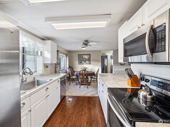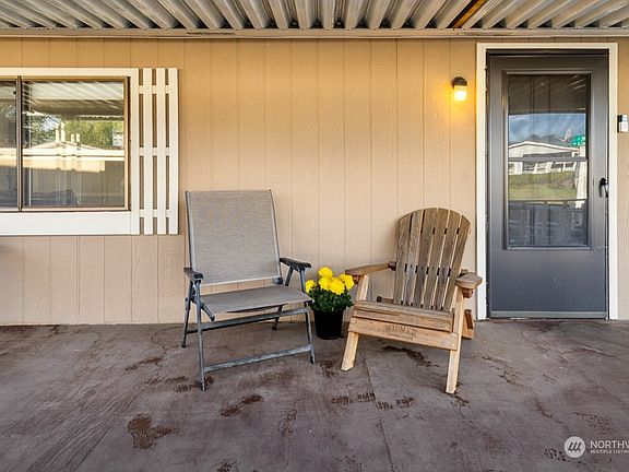 Live in the comfort & convenience of Mountain Villa Estates, a vibrant 55+ community in Enumclaw. This corner lot home is tastefully updated & features an open floor plan. The kitchen has been renovated w/ fresh white cabinetry, ss appliances & breakfast counter. Adjacent utility room w/ laundry, storage & ext. access. New plumbing, composition roof & water heater in 2023. Spacious primary suite w/ walk-in shower. Extended outdoor living spaces w/a charming covered front porch, private patio & even fruit trees amongst the low-maint. landscape. Onsite parking for 3 vehicles, storage shed (2016) & wheelchair ramp (2021.) The comm. features an active clubhouse along w/ quick access to walking trails & local amenities. $1,319 space rent.