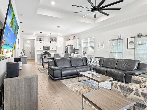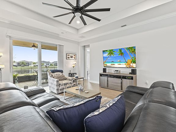 Why wait to build? Enjoy resort-style living in this 2023 home-3 bedroom, 3-bath home showcasing a rare open-concept, split floor plan with spacious bedrooms, ample storage, and custom cabinetry. Recently all three bathrooms have been beautifully upgraded with frameless doors/new hardware and both patio/driveway pavers resealed.Entertain in the gourmet kitchen featuring quartz countertops, custom cabinets with crown molding, gas stovetop, stainless steel appliances, and a built-in coffee bar. Impact windows, a tankless water heater, and sleek 6''x24'' tile elevate the home's modern elegance.Step outside to a fully fenced backyard overlooking a peaceful lake--perfect for relaxing or hosting guests. Owners are willing to contribute funds towards closing costs with an acceptable offer