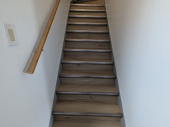 A single staircase leads to the bedroom upstairs, which has a ceiling fan and a closet. The flooring on the stairway and upstairs has been upgraded as of September 2025.