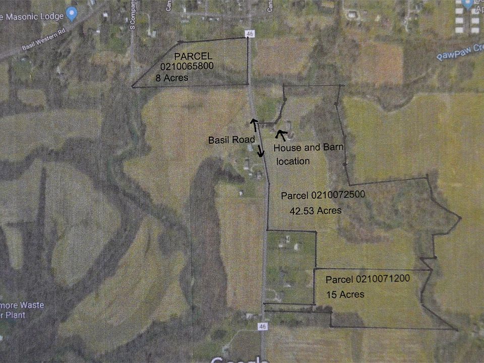 Beautiful farm that sits along the banks of Walnut Creek, with great views of the winding creek below, just south of the Village of Baltimore Village limits. Three parcels of ground, 8 acres, 15 acres and 42.72 acres with a total frontage of 1140' of road frontage along Basil Road. Turn of the century house, with most of it having the original trim and floors with some updates. Large barn on the property behind the house.