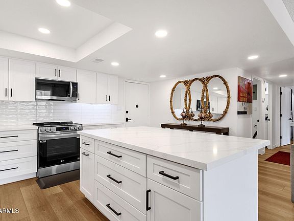 Experience resort-style living in the heart of Old Town Scottsdale at Scottsdale Shadows! This FULLY REMODELED 2-bedroom plus bonus room and den, 2 bath condo offers 1,369 sq. ft. of spacious living with a bright, open floor plan. The updated kitchen (2024) showcases white shaker cabinets, marble countertops, a large center island, stainless steel appliances, and an abundance of cabinet and counter space perfect for cooking and entertaining. The kitchen flooring and bathrooms were also updated in 2024, adding a fresh, modern touch throughout. Enjoy an oversized family room with plenty of natural light and laminate flooring throughout. The living area features large sliding glass doors that open to a covered, patio, ideal for indoor-outdoor living. Unique to this condo is an additional den with its own sliding door to the patio offering endless possibilities as an office, extra bedroom, or secondary living space. The primary suite includes a walk-in closet and private ensuite bathroom, while the bonus room provides flexibility for another workspace, reading nook or hobby area. Residents of Scottsdale Shadows enjoy resort-style amenities including three heated pools and spas, a 9-hole private golf course, tennis and pickleball courts, a fitness center, art and woodworking studios, library, game room, clubhouse, 24-hour guarded gate, and underground parking. All of this is located just minutes from Old Town Scottsdale's premier shopping, dining, and entertainment.