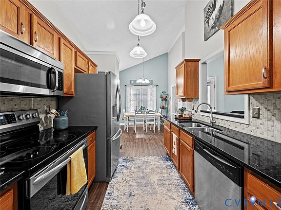 Renovated 3-bedroom, 2-bath ranch on a cul-de-sac lot in the highly desirable Ashbrook Community, where residents enjoy walking paths, a lake, a playground, and tennis and basketball courts. Located near top-rated schools, healthcare, shopping, dining, fitness facilities, and with easy access to Hull Street and Route 288, this home combines convenience with community living. Inside, a welcoming foyer opens to a light-filled living room with vaulted ceilings, a gas fireplace, and access to the screened-in side porch. The updated galley kitchen features granite countertops, a tile backsplash, stainless steel appliances including a five-burner glass cooktop with convection and air fryer option, a smudge-proof French door refrigerator with dual ice maker, a pantry, and ample cabinet space. The adjoining bay-window dining area is perfect for everyday meals or entertaining. The spacious primary suite includes vaulted ceilings, a walk-in closet, and a private bath with double vanity, soaking tub, and separate shower. Two additional bedrooms, each with ceiling fans and closets, share a updated full hall bath completed in 2024. Outdoor living offers a screened-in porch, firepit, and fully fenced backyard, while the two-car garage and paved driveway add both storage and convenience. Recent improvements provide peace of mind, including a new CertainTeed Landmark AR Lifetime Roof installed in 2025 with transferable warranties, newer LVP flooring, a newer front door and screen, fresh interior paint, updated light fixtures, ceiling fans, and leaf guards.