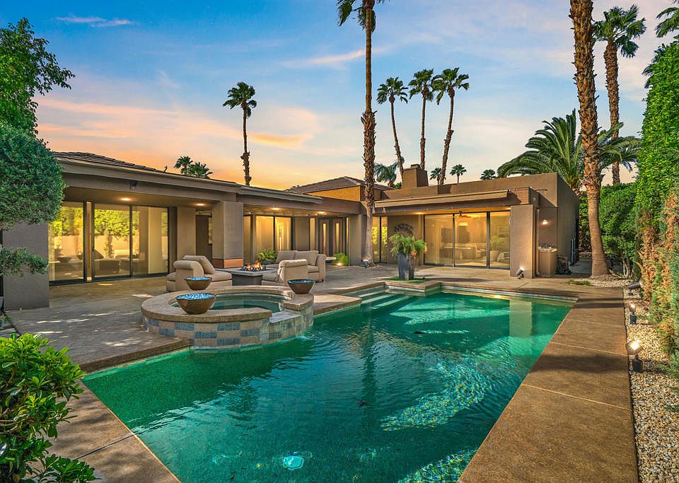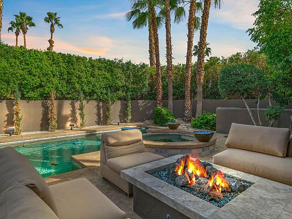 THE EPITOME OF DESERT ELEGANCE IN PRESTIGIOUS PAINTED COVE! Embrace refined sophistication in this exquisite contemporary home, perfectly nestled on a serene corner lot within the exclusive gated enclave of Painted Cove in La Quinta. Offering 3723 Sq Ft of beautifully curated living spaces seamlessly blending privacy, luxury and effortless indoor-outdoor living at its finest! A grand arrival begins at the bronze and metal double doors opening to an airy, light filled floor plan that exudes understated elegance. The living room and dining room combination serve as the heart of the home flowing gracefully into the family room, creating a sense of volume, connection and warmth. The ideal setting for both intimate gatherings and grand scale entertaining! The open chef's kitchen is where form meets function, recently elevated with premier sub zero refrigeration, Wolf gas cook top, Wolf high speed oven with 2 warming drawers and a Cove dishwasher completed by a lovely breakfast nook and breakfast bar. Delight in high ceilings, expansive windows and refined finishes that enhance the contemporary ambiance, while new interior paint, luxury vinyl plank flooring throughout add modern cohesive sophistication. Thoughtfully designed, this home features 4 bedrooms and 5 bathrooms ensuring comfort and privacy for all. The generously sized attached casita, with private entrance, provides a serene retreat for guests. The primary suite is a true sanctuary with an oversized walk in closet, spa inspired bathroom with double vanities, new stone flooring and separate shower and tub. Each guest room is an ensuite with one transformed to a refined home office. Not to be forgotten is the interior laundry room with newer appliances. The three car garage has been refreshed with flooring recoated. The third car garage also functions as a personal gym with an mini split A/C! OUTDOORS discover a private resort style oasis around the entire home, framed by lush low maintenance landscaping. The sparling pool/spa beckons relaxation, supported by a high efficiency Pentair pump and Aquastar filtration system! Electric retractable awnings create shaded retreats ideal for alfresco dining, quiet morning or sunset gatherings! Abundant serenity, beauty and impeccable design can be found here! Close to amazing golf, fine dining, shopping and the Indian Wells Tennis Gardens! LUXURY. GRACE. LIFESTYLE is what you find here at Painted Cove in La Quinta!!