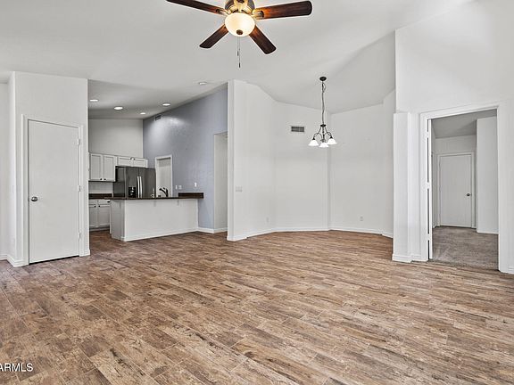 Inside, the open-concept layout features porcelain wood-like tile in the main living areas, & high ceilings that give the home a light & airy feel. The kitchen includes granite countertops, white cabinetry, & stainless steel appliances—ready for your personal touch.