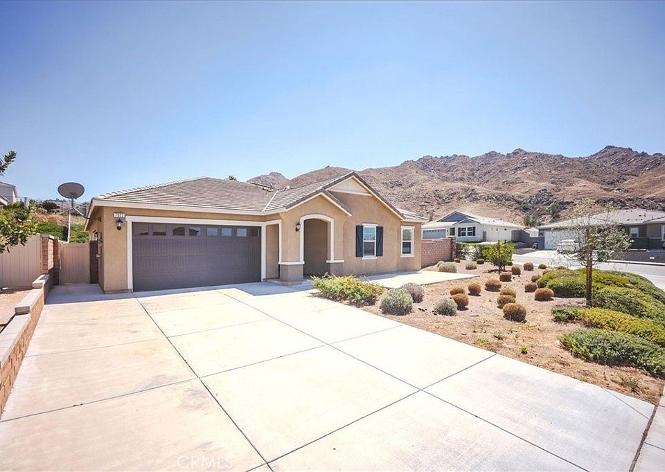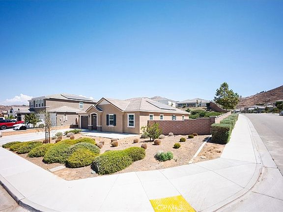 HUGE price improvement! Stop by today! PAID OFF SOLAR PANELS, and appliances included! Newer single story, corner home with a lot of upgrades throughout. The lot is big enough to add RV parking, a pool or your entertainers heart desire. NO HOA! Property has 4 Spacious Bedrooms, and 2.5 Bathrooms featuring a master bath with both a shower and a separate soaking tub for ultimate relaxation. The Kitchen was upgraded with sleek granite countertops, huge kitchen island, pantry, high ceilings, open concept, with a very large separate den perfect for entertaining and hosting. The very large primary suite is an amazing retreat, with ample space and equally spacious walk-in closet. The Primary bath features double sinks, a bathtub and separate shower! Fully landscaped back yard, and drought friendly front yard for added convenience! Home is within minutes of UCR, Sandals church, parks and walking trails.