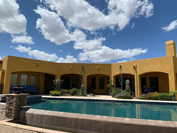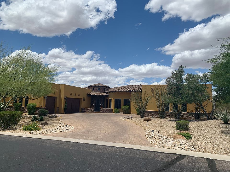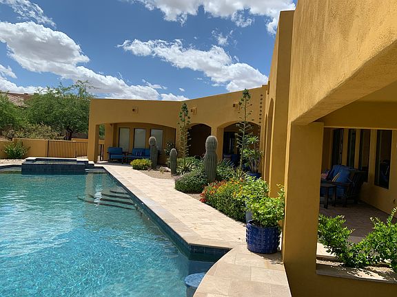 An Entertainers DREAM! This custom beauty showcases the finest details throughout. Recently upgraded with design features suited for the most discerning buyer. Hardwood & Travertine flooring, custom interior paint & plenty of space to host family & friends. This open concept boasts gracious rooms with ample storage. Bring the toys, because this 4 car garage will allot for multiple vehicles. Wolf, Subzero, Viking, Bosch: Nothing has been overlooked. Seller upgraded ALL NEW appliances, TV's & water heaters within the past three years so you don't have to, making this home READY to move-in! The newly built Ramada has been carefully designed with an outdoor kitchen, fireplace and offers various seating areas to take in the views. No other home offers a pool like this! A true desert oasis!