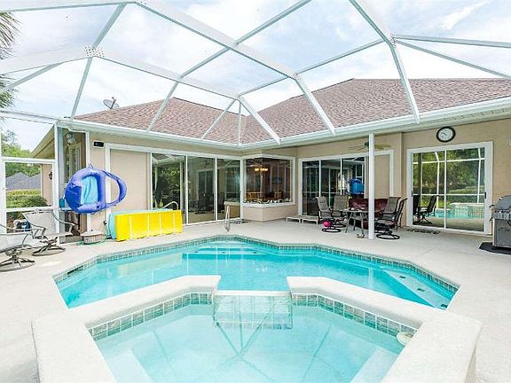 This is a remarkable Rutenberg floor plan with spectacular views! A 3 bedroom, 3 bath with an office, this home is centered around the screened in pool area. Featuring floor to ceiling glass that slides completely out of view, basically the entire home connects to the pool deck that is primed for entertaining. With a hot tub that cascades down into the concrete pool, the mood is set for relaxing. Or, enjoy the views of the beautifully landscaped yard and golf course from the spacious living room and open kitchen. The highly functional split plan allows the master bedroom to have complete privacy, but the multiple living areas encourage socializing with friends and family. With a recent roof and a freshly resurfaced pool deck, this home should be easy to keep for years to come. Modern amenities such as smart thermostats, a video door bell, a new tankless water heater, and more, make this home the one to end the search.