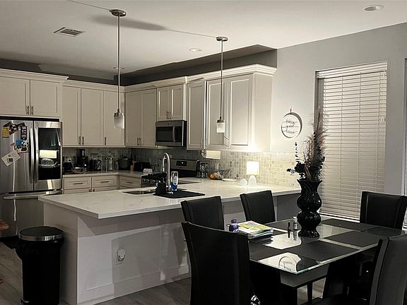 Golf course viewsStainless steel appliancesQuartz countersCoffered ceilingsWhite cabinetsWood-plank tile