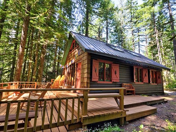 Camp Creek 1936 log cabin in the Mt. Hood National Forest. Well maintained end of road cabin with sleeping loft, wood floors, paned windows and beautiful fireplace with tile hearth. Windows look out over a pristine forest. Sunny deck overlooking the creek. Updated kitchen. Outbuilding for storage. You'll love the high vaulted ceilings and the open floor plan with craftsmanship throughout. Two creeks.Ten minutes to the slopes. 1 hour PDX