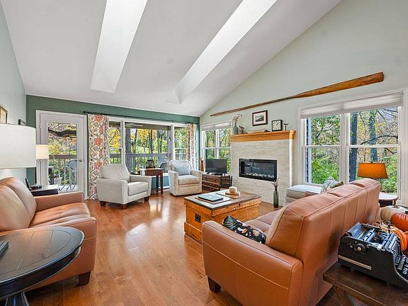 For more photos or to schedule a tour, visit website below. Spacious condo in the unique and secluded neighborhood of the Forest of Cold Stream. Completely reimagined and updated, this unit offers the option of living on one floor if desired. The street level floor offers a large gourmet kitchen flowing into a large dining area and open concept living room featuring skylights and custom oak and steel beams. Large windows offer scenic views of the surrounding woodland and gardens. Separated by a hallway from the living area is a large primary bedroom. A dressing area and walk in closet lead into a well-appointed bath with double vanity and large shower. A door opens into the convenient laundry room with new washer and dryer and storage. The second bedroom is on the front of the house and has an ensuite bath with an antique sliding door adding additional privacy from the rest of the house. Stairs off the foyer lead to a daylighted lower level with a versatile layout that can be used for a variety of purposes. The finished area has durable tile flooring and a kitchen size wet bar and entertaining space that is currently being used as an art studio. A private hallway leads to the third bedroom, full bath with shower and Jacuzzi tub, and a storage closet for off season clothing. The unfinished portion of the basement has a woodshop with new luxury vinyl flooring and a separate storage area. This property also includes a covered porch, stone patio as well as pleasant garden spaces. It has a distinctively large area of greenspace on the west side of the unit providing privacy and enhancing views of woods Features include a new HVAC system, new washer and dryer, new double oven and dishwasher, two gas fireplaces with newer inserts and an oversized garage with new storage cabinets.