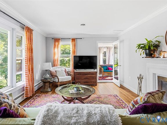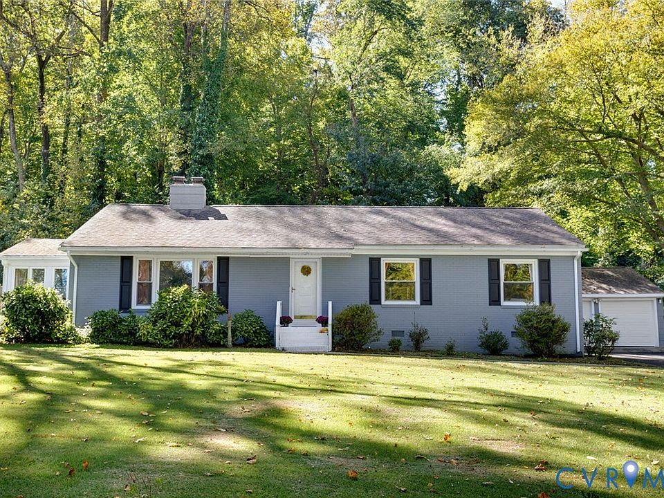 Welcome to this beautifully maintained home in a picturesque setting, directly across from the scenic Rock Creek Park Lake. Enjoy the tranquility of nature and the convenience of nearby amenities, all from the comfort of this inviting one-level home. Step inside to discover a spacious, sun-drenched living room featuring large windows that frame views of the lake and lush greenery. A handsome mantle adds warmth and character to the space. Hardwood floors throughout. Adjacent to the living room is a generous dining area with its own cozy fireplace and elegant mantle—ideal for hosting family dinners or special gatherings. The upgraded eat-in kitchen features painted cabinetry, tiled floors, and stylish butcher block countertops—blending vintage charm with modern functionality. The home offers three spacious bedrooms, including a primary bedroom with a private full bathroom with shower. A second full bath boasts charming original vintage tile. Enjoy year-round comfort in the lovely tiled sunroom, which opens to a spacious deck overlooking the private, fully fenced backyard—a perfect retreat for relaxing, gardening, or entertaining. Detached two-car garage offering ample space for vehicles, storage, or a workshop. A circular driveway wraps around a parklike area. Lakefront area with picnic tables and wonderful views directly across the street! Easy access to Midlothian Turnpike and Powhite Parkway. This home combines nature, convenience, and timeless charm in one ideal package.