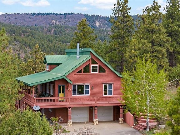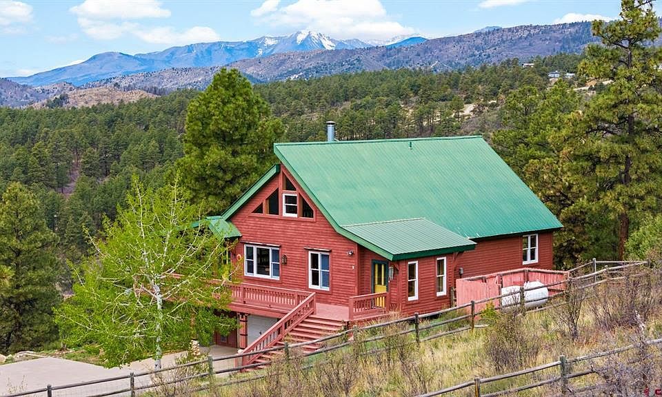 Situated atop a picturesque mountainside, this stunning 13.7 acre rustic country home offers unparalleled views of the surrounding peaks and valleys - a true sanctuary of privacy and tranquility. Thoughtfully designed for relaxation and livability, the home features three well-appointed bedrooms, a spacious loft, and a versatile bonus room that can be used as an office or guest quarters, with expansive windows all around showcasing breathtaking mountain vistas to the west and north. The main level boasts an impressive 1,335 sq. ft. wraparound deck, with both covered and open sections, allowing for year-round enjoyment - whether soaking up the sun, simply enjoying nature, or marveling at stunning sunsets over the snowcapped La Plata Mountains. The spacious open-concept kitchen, outfitted with modern appliances, ample counter space, and multiple seating options, flows seamlessly into the inviting dining area and living room with vaulted ceiling, where the wood stove creates a cozy and relaxing atmosphere. The primary suite, also on the main floor, features an elegant en suite bathroom and French doors leading to the deck, offering a peaceful retreat with direct access to nature. A second bedroom with stunning views and full bathroom are also conveniently located on this level. Upstairs, a spacious loft and bonus room, with cathedral ceiling and adjacent bathroom, provide additional flexibility for sleeping quarters, a study, or recreational space. The lower level hosts a third bedroom with a large full bath and access to a 540 sq. ft. covered walkout porch, offering yet another serene space to unwind while enjoying the surrounding landscape. Designed for ultimate relaxation, the home also includes a rejuvenating sauna and a strategically placed hot tub, perfect for soaking under the stars. Additional features include a 720 sq. ft. oversized two-car garage with built-in storage and work space, ample parking for recreational vehicles, a fenced side yard for pets, and a gated entrance. Unique architectural touches throughout the home enhance its distinctive charm, making this a perfect mountain residence that seamlessly blends luxury, comfort, and natural beauty.