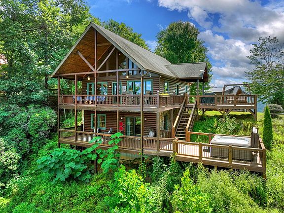 Luxury Mountain Escape Surrounded by Endless Horizons. At 2,600 feet elevation, this remarkable mountain retreat showcases sweeping, unobstructed views of Georgia, Tennessee, and North Carolina—an extraordinary vantage point that defines the essence of Blue Ridge living. Built to impress and designed for comfort, this home seamlessly blends rustic elegance with modern convenience, offering both a proven short-term rental history and a serene escape for its owners. In just 10 months on a rental program, it has already established strong returns, comfortably accommodating 10–12 guests with ease. Step inside to soaring cathedral ceilings, warm wood finishes, and a dramatic stone fireplace that anchors the open-concept great room. The kitchen combines function and style with quality appliances, abundant cabinetry, and an extra bar for casual seating. A perfectly sized loft overlooks the living space, ideal for a quiet office, reading nook, or additional sleeping quarters. Both bedrooms provide the feel of private retreats, each opening onto its own covered porch for enjoying morning coffee or peaceful mountain evenings.The finished terrace level is thoughtfully designed for both relaxation and entertainment, featuring built-in bunk beds, a spacious game area, private bath, and laundry, with direct access to the hot tub and expansive decks. Outdoor living is truly exceptional, with multiple levels of decking, a large hot tub, and a custom fire pit—all oriented to capture the home's unmatched, long-range vistas. Just 11 miles from Downtown Blue Ridge, this property offers the perfect mix of privacy and convenience. Enjoy boutique shops, galleries, wineries, breweries, and farm-to-table dining, along with Lake Blue Ridge for boating and fishing and nearby scenic hiking trails. With unmatched long-range views and a strong rental history, this home is a rare opportunity to own both luxury and lifestyle in the North Georgia mountains. Furnishings negotiable on a separate BOS.