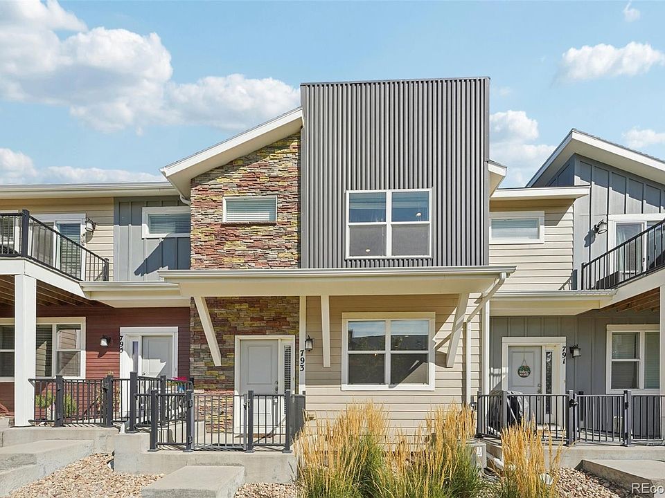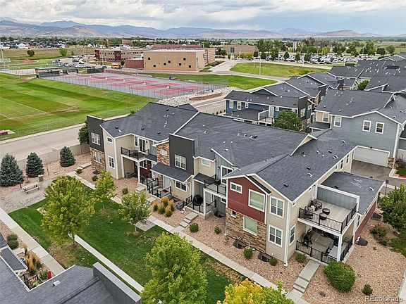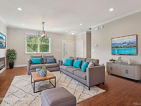 Step inside this modern townhome and immediately feel the pull of the Rocky Mountains right from your front door. Designed with unique touches not found elsewhere in the community, this home boasts an open, light-filled layout that feels both spacious and inviting. The chef’s kitchen is a showstopper with crisp white cabinets, a contrasting extended island, granite countertops, soft gray subway tile, matte black designer lighting, and a stainless farm-style sink and appliances. A custom double-door pantry keeps all your essentials organized and within reach. Warm hardwood floors flow across the main level while crown molding adds an extra touch of elegance. Thoughtful interior lighting on every floor keeps the space bright and the modern electric fireplace makes cozy evenings effortless. Upstairs, choose between two incredible suites, each featuring large walk-in closets and spa-inspired bathrooms with upgraded tile and double vanities. Step out onto the upper-level balcony to soak in breathtaking mountain views or breeze through laundry in the conveniently located upstairs laundry room with built-in shelving. The finished basement with high ceilings and multiple windows provides versatile space perfect as a third bedroom with an ensuite or a large recreation area. Enjoy crisp, clean water every day thanks to the advanced water filtration and softening system. With abundant storage and a two-car garage, there’s room for all your gear. Beyond your doorstep, the neighborhood offers excellent schools and direct access to the 23-acre Dry Creek Park complete with trails, disc golf, picnic spots, playgrounds, and even a sledding hill. You’re also just minutes from shopping, dining, cinema, Whole Foods, and more, making this home the perfect blend of comfort, style, and convenience.