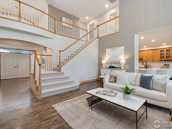 Welcome to this beautifully remodeled 2-Story Estate, featuring a main level Master Suite & fully finished walkout basement, set on over a half-acre lot in the highly desirable & amenity-rich community of Eagle Ranch Estates. This home showcases a variety of recent upgrades, including modern front doors, beaming hardwood floors, new carpet, fresh paint, quartz countertops, custom lighting & plumbing fixtures and more. Step inside the double entry foyer to the expansive Great Room with cathedral ceilings, a gorgeous stone fireplace, built-in shelving, & French doors to the large deck & private yard. The bright & open floor plan flows seamlessly into the gourmet kitchen boasting brand new stainless steel appliances, an elegant breakfast bar and backsplash, & charming bay windows. Retreat to the luxurious, newly renovated Master Suite complete with 5-piece bath, gas fireplace, walk-in closet & direct deck access. A separate office with built-ins and formal dining room with wine bar round out the main level. Upstairs, discover a secondary en suite with reservoir views, double balconies, 2 additional bedrooms, a full bath, & a cozy loft overlooking the Great Room. The spacious basement with built-in entertainment center, large rec area, bonus room, second kitchen, wine cellar, & additional bedroom/bath combo is perfect for entertaining guests. A brand new roof, 2 new HVAC systems, 2 new 50-gallon hot water heaters, a new radon mitigation system, & multiple new windows ensure peace of mind for years to come. Eagle Ranch Estates provides an unparalleled lifestyle, conveniently close to I-25 & just minutes from all that Northern Colorado has to offer. From panoramic mountain views, fishing in the community ponds, playing pickleball or basketball, engaging in book clubs & neighborhood social events, or bird watching at Fossil Creek Reservoir across the street, there is always something to enjoy in this vibrant and tranquil community!