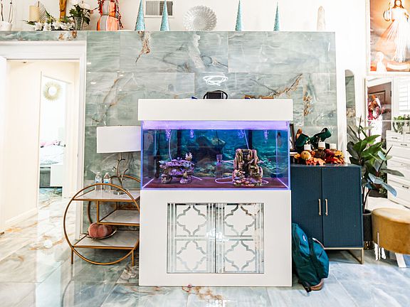 Heated saltwater swimming poolOpen modern-concept layoutDesigner tile flooringFamily roomDecorative lightingDining areaLots of natural light