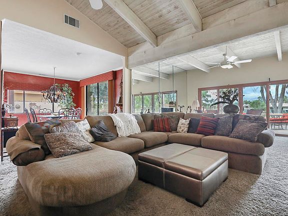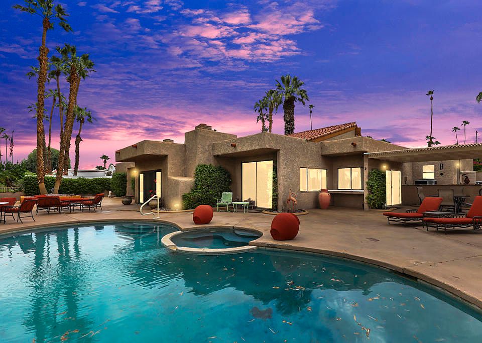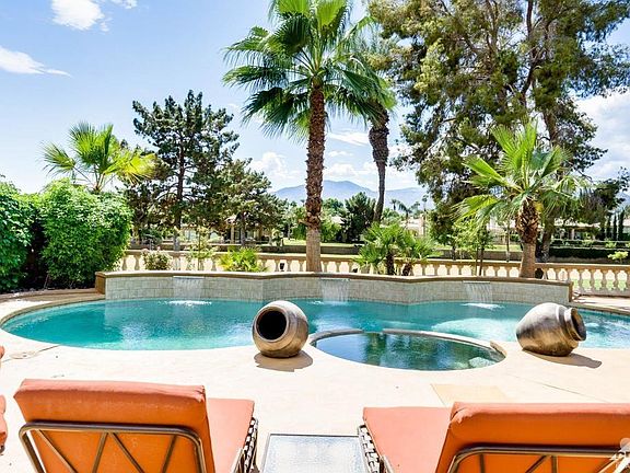 Looking for a terrific entertaining home! Located on the 2nd fairway, with Southern mountain views, this custom 3 bedroom, 3.5 bathroom home has a truly low maintenance, Texas-sized rear yard with a covered BBQ/dining area directly off the kitchen. Sparkling spa and pool with a water feature above the fairway and spacious patio area for entertaining dozens of friends and family - even an outside bathroom with shower!!The interior features beamed, vaulted ceilings, a formal dining room with mirrored wall, an island kitchen and large living room with a sit down bar. The sumptuous primary suite, complete with fireplace, walls of glass and more beams, opens to an outdoor patio area and features his and hers bathrooms with separate walk-in closets. A large second bedroom with custom furniture is currently used as an office and/or guest bedroom and shares a jack-n-jill bathroom with the 3rd bedroom. Two-car garage plus golf cart garage. HOA of only $214 a month includes cable TV with two boxes with HBO/Cinemax/Showtime plus internet with Spectrum - PLUS 24-hour guard gated security!!Rentals must be 30 days or more.