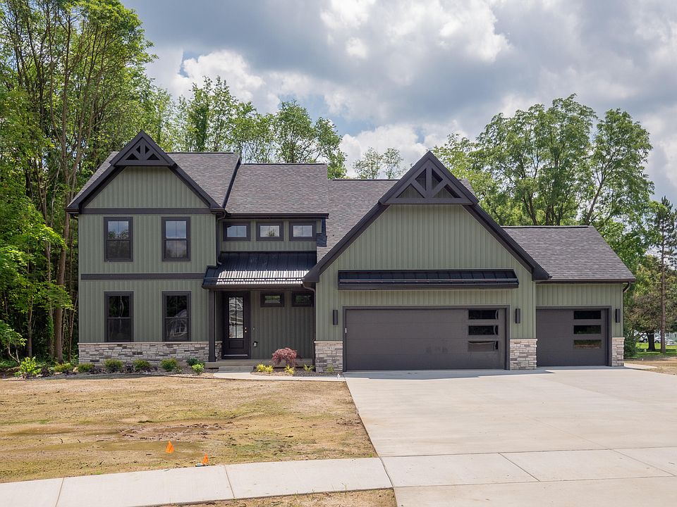 Stunning new black modern farmhouse by TMR Builders in Autumn Woods! This home blends comfort w/ style and offers all the high end finishes you deserve! As you step inside, this home greets you w/ a soaring 2-story foyer. Main floor den (w/ custom built in's) off entryway, great rm featuring gas FP flanked w/ custom built in's & floating shelves, dining area w/ slider to large composite deck, gorgeous kitchen w/ 7' center island/quartz counters, walk-in pantry w/ butcher block counter/wood shelves; 1/2 bath & mudrm w/ built in bench off garage. Upper level incl. spacious primary BR (walk in closet, tile shower & dual vanity), 3 addt'l. BR's, 2nd full bath w/ tub/shower combo w/ tile surround & convenient 2nd floor laundry rm! Still time to customize selections! Kalamazoo Promise eligible!
