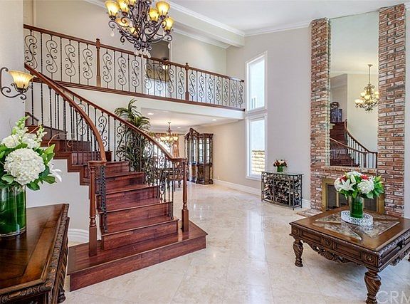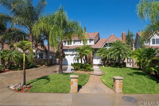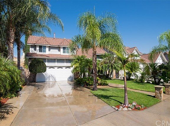 Fantastic two-level home located in Anaheim Hills features gorgeous curb appeal and maintained tropical landscaping. Enter through double door formal entry to this gorgeous 4 beds 3 bath home in the highly sought after East Hills Community. This home features a warm and open floor plan complete with vaulted ceilings, polished travertine flooring and multiple windows offer a bright well lighted interior. Host dinner parties in the formal dining room complete with wet bar and close proximity to the kitchen. The spacious kitchen features maple wood cabinets, granite counters, stainless Kitchen Aid appliances and breakfast nook area. Kitchen is open to the great room with fireplace and gives this home a warm and inviting atmosphere. As you move through the rest of the first floor, you will notice the cleanliness and attention to detail. A wooden staircase takes you to the second floor and is gorgeous focal point with custom wrought iron and wood banister. Second floor has the master suite plus 3 bedrooms - are all generous in size and offer cherry wood flooring, ceiling fans and plenty of closet space. The master suite is luxurious and offers a spa inspired remodeled bathroom with dual sinks large soaking tub and separate shower. The back yard is perfect for outdoor dining with a covered patio, serene waterfall feature and mature tropical landscape. Additional amenities to note are: New roof, new windows with lots of natural light, new HVAC, remodeled kitchen an