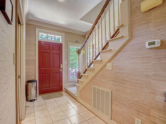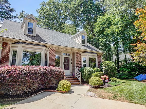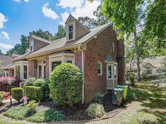 Welcome to your charming 1.5-story brick-end unit townhome secluded in the desirable Carriage Bluffs subdivision, located in the very heart of North Raleigh! This delightful home features 2 bedrooms and 2 baths, offering comfort and style in an efficient floor plan. An abundance of windows fills the space with natural light and views of nature surrounding this beautiful, private lot. As you enter, you'll be greeted by the spacious living and dining rooms, both boasting a big bay window and a cozy fireplace that adds warmth and ambiance. Walk up 2nd floor of almost 1,000 square feet of insulated, unfinished space. Use it for storage, a studio space, or finish as you see fit. The kitchen has generous cabinet space and a delightful breakfast nook perfect for morning coffee. The first-floor primary bedroom is a true retreat, with two generous closets, and an ensuite bathroom. An additional bedroom on the main level provides flexibility for guests or a home office. Enjoy easy access to nearby shops, entertainment, hospitals, and RDU! Don't miss the opportunity to make this your new home!