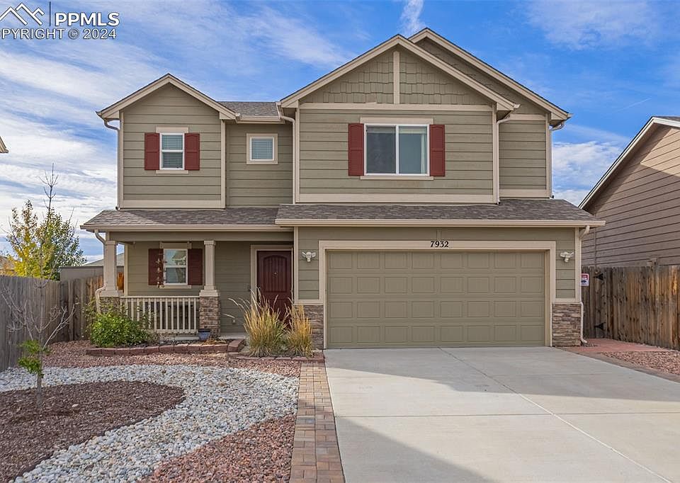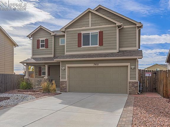 Gorgeous 3 bedroom 3 bathroom home on a cul-de-sac in the sought after Bent Grass community. The covered front porch warmly greets you as you enter. The eat in kitchen features granite countertops, tile backsplash, stainless steel appliances and a walk in pantry. This area walks out to a nice sized backyard with a large concrete pad, wood pergola, and grass area with underground irrigation. The main level is finished off with a cozy family room and a powder bathroom for guests. Upstairs you will find a generous size primary suite with a soaking tub, free standing shower, dual sinks, and a large walk in closet. There are two additional bedrooms upstairs that share a bathroom, jack and jill style. The upstairs also includes a large laundry room with space for storage. This modern design home has extra windows at every turn that provide an abundance of natural light as well as newer carpet and laminate flooring throughout. The extended driveway has room for all your toys and guests! This home is part of the Woodmen Hills Metro District with access to two community centers with workout areas, pools, and clubhouses. Bonus no HOA!