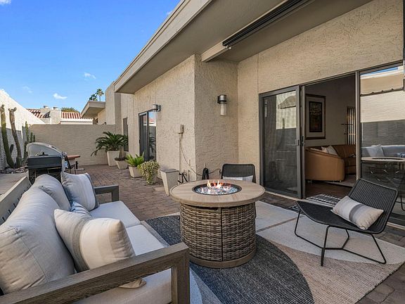 Pricing varies - see below. Contemporary Southwest fully-furnished townhome w/ midcentury modern touches. Spacious 1,841 sq ft 3bd/2ba single level, located in friendly Scottsdale Monterey community. Prime location across from heated community pool and spa, near walking and biking paths along Scottsdale's miles-long greenbelt. Walk to grocery store, shopping, and Chaparral Lake park. Fully equipped kitchen with granite counters, opaque-fronted cabinetry, and stainless appliances. Soaring beehive fireplace, 2 entertaining patios with comfortable seating and BBQ in the back. Spacious primary suite with large walk-in closet and luxurious bathroom with rain showerhead. Two-car garage. Private laundry in home. WiFi. Primary bedroom with King bed. Private and comfortable 2nd bedroom with Queen bed, and third bedroom has a sofa bed.