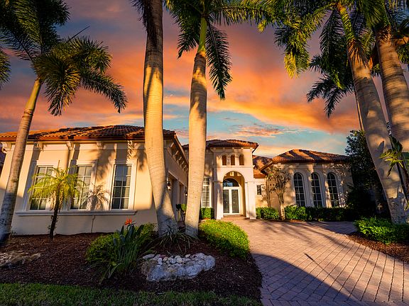 This spectacular 4BR/4/1BA home is perfectly located on Tradition #17 with stunning views of the golf course, water, and picturesque fountain. Featuring soaring ceilings and luxurious high-end finishes throughout, this home is impressive from the gorgeous, elevated street presence, through to the main living areas with floor to ceiling windows, marble tile flooring, extensive ceiling details, and elegant nooks perfect for your art collection. An effortless flow leads through to the large kitchen with center island, SS appliances, breakfast nook, and rich mahogany cabinets which exude luxury and warmth. The incredible primary bedroom features extensive moldings and a tray ceiling plus views over the beautiful pool, jacuzzi waterfall, and golf course beyond. You'll find access from here to your expansive lanai and pool area where you have a summer kitchen with built-in gas grill, plenty of space for entertaining, a large pool, and beautiful landscaping offering you plenty of privacy. This remarkable home has 3 spacious guest bedrooms, a home office, plus a 2.5-car garage. And you can hop in your golf cart and be at the community clubhouse in minutes!