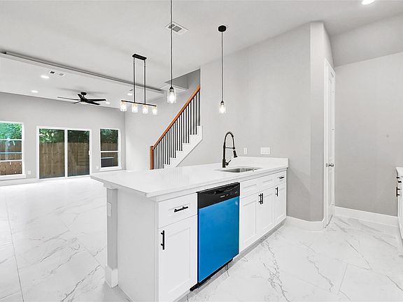 High ceilingsCeiling fansLarge windowsQuartz countertopsBright spaceElegant tile flooring