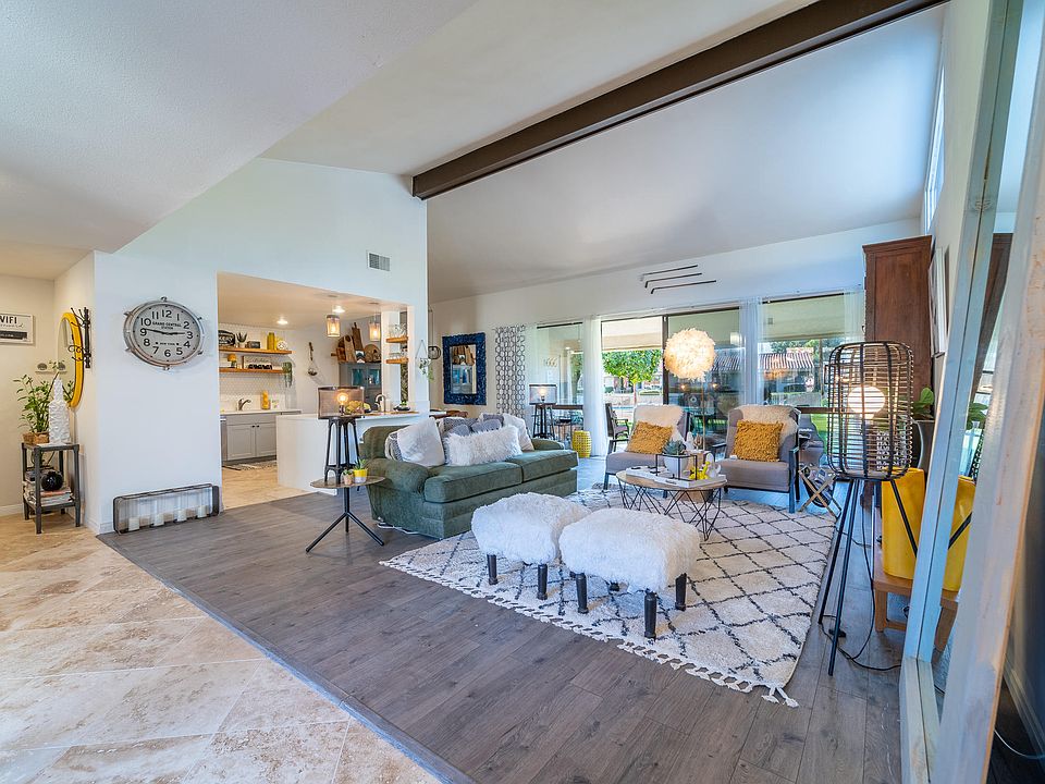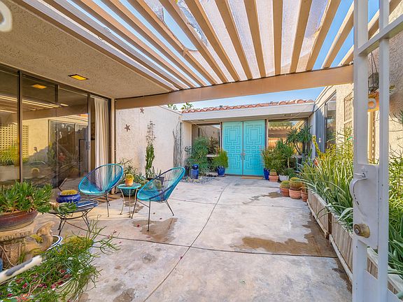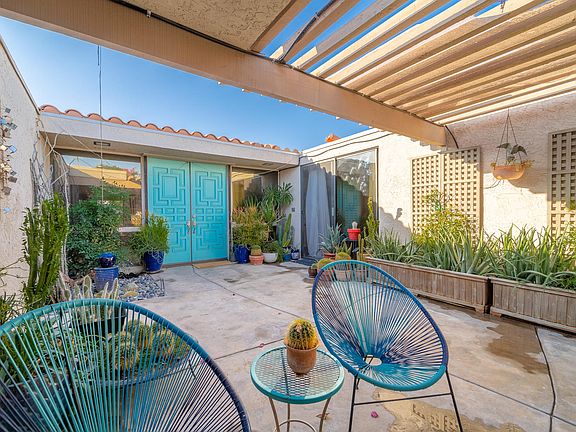 This amazing condominium has been recently remodeled and tastefully upgraded throughout. There are two spacious primary bedrooms. One has a patio that faces the pool and in addition, has an office desk built into the large walk-in closest. The other primary has a large ceiling to floor slider opening to the courtyard. Also, this bedroom has a spa-like bath with a romantic free-standing bathtub and a beautiful walk-in shower with stenciled tiles. The third bedroom has a bath adjacent and is located on the other side of the home, also with a large slider off the courtyard. You will appreciate the large, private center courtyard with lush plantings. Through the tall solid wood double doors, you will enter into the great room, the heart of the home with high vaulted ceilings and an exquisitely remodeled kitchen and cozy dining area. No one will be able to miss the views of the rolling lawn to the crystal blue community pool through the wall of glass. Just outside the great room is the large covered west facing patio. Adjacent is a golf cart/storage area. This home is located in the famed Bermuda Dunes Country Club. Host to the Bob Hope Classic, as well as, home to celebrities, Clark Gable, Cary Grant, and Arnold Palmer to name a few. As an added benefit, this home is located in a private gated community within the golf club. It is a short stroll to the clubhouse. This is a rare end unit. Upgrades includes new roof & a built-in safe.