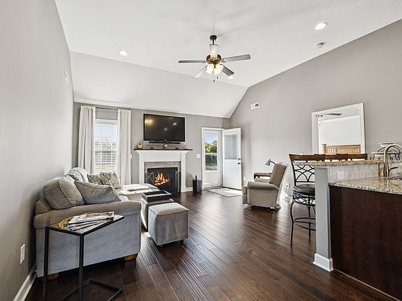 The living room features soaring 12-foot ceilings, a cozy gas fireplace, and engineered wood flooring, all complemented by neutral paint tones throughout. The kitchen is both stylish and functional, offering granite countertops, a breakfast bar, stainless steel appliances, and a generous pantry.