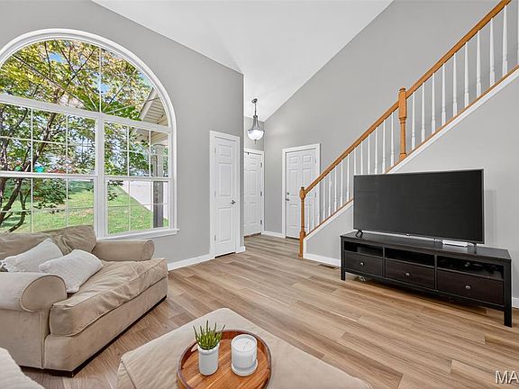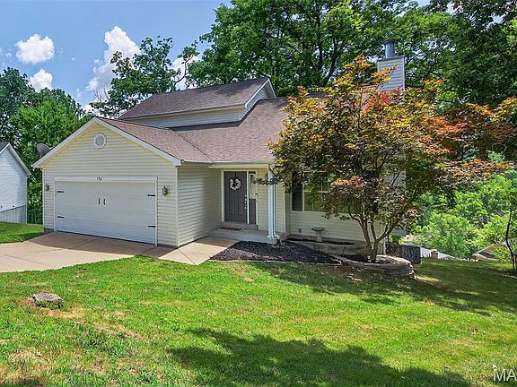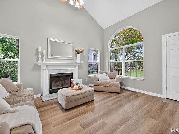 Welcome to this beautifully maintained 1.5-story home nestled on a quiet cul-de-sac, just minutes from Gravois Bluffs shopping and dining! Step inside to an open floor plan featuring a vaulted great room with luxury vinyl plank flooring, abundant natural light, and a cozy woodburning fireplace. The bright kitchen is equipped with white raised panel cabinets, stainless steel appliances, a pantry, and breakfast bar, while the vaulted dining area with bay window provides the perfect space to entertain family and friends. The main floor master suite offers a spacious walk-in closet and a luxury bath with separate tub and shower. A convenient main floor laundry and guest powder room complete the main level. Upstairs, you’ll find two additional bedrooms with new carpet, a full bath, and a versatile loft area. The finished walk-out lower level provides even more living space, featuring an open family room, a fully updated bathroom, and a bonus room perfect for a guest bedroom, home office, or playroom. Step outside to enjoy the peaceful wooded lot from the deck. Welcome home!