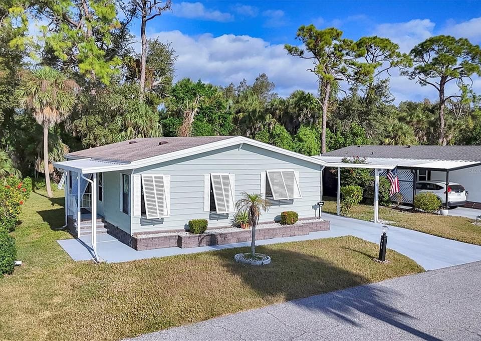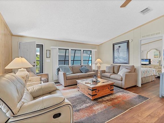 A unique split- floorplan home perfectly describes this meticulously maintained and furnished piece of paradise! The master and guest bedrooms are on opposites sides, providing your guests the privacy they will enjoy. This highly sought-after gated community of Tangerine Woods, is an active and friendly, 55 and over community! For your leisurely pleasure, enjoy the large heated pool and clubhouse, with an exercise room and library, tennis and pickleball courts, walking trails, shuffleboard and so much more! This light and bright, turn-key, beautifully furnished home offers all the comforts you need to move right in. The roof was replaced in 2023, the A/C in 2025, and new flooring in 2022. The kitchen, complete with an abundance of cabinets and cupboards, has a breakfast bar and stainless-steel appliances. The spacious living room is just perfect for entertaining your family and friends. The master bedroom with ensuite bathroom is beautifully furnished and boasts a walk-in closet. The bed pictured in the guest bedroom, is actually 2 twin beds and can be separated to accommodate your guests. The guest bedroom also has a walk-in closet. The enclosed screened lanai is the perfect place to enjoy your morning coffee, watch your favorite sports team on TV, or read a good book. There is even a sleeper couch for relaxing on the lanai! With a patio off the lanai, it is ideal for outdoor grilling and enjoying some fresh air. The private backyard boasts a greenbelt area, not to be built on, and is lush and green. For your convenience, the sale includes a Craftsman 3500 Generator. Whether this is the perfect winter home or full-time residence, Tangerine Woods is a much sought after land-owned community. This home could be your next home-sweet-home...call today for your showing appt!