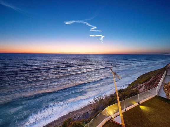 Immerse yourself in the breathtaking beauty of the Pacific Ocean from one of the most enviable locations on Neptune Avenue in Leucadia, Encinitas. This remarkable property, perched on a 50 foot wide bluff that has been geotechnically reinforced with two walls: a lower sea wall with tie-backs and an upper bluff wall with caissons, tie-backs and a grade beam. Offering some of the most expansive sit-down panoramic ocean views from La Jolla to Dana Point. This home is ideally situated within walking distance to California’s pristine beaches, including Beacons Beach and Moonlight Beach, as well as the vibrant local 101 corridor, known for its organic cafes, yoga studios, gyms, surf shops and gastropubs. The neighborhood is celebrated for its eclectic charm and relaxed atmosphere, making it a prime spot for those seeking an active lifestyle. The interior of the home features a second-story great room with high vaulted ceilings, exposed wooden beams, and a full western wall of windows that flood the space with natural light and stunning sea views. The modernized chef’s kitchen is equipped with slate floors, bird’s-eye maple cabinets, roll out shelves in all cabinets, dual ovens, subzero fridge and raw edge granite countertops. The primary bedroom, located on the lower west side of the home, offers uninterrupted lay-down views of the ocean. Each bedroom boasts an ensuite bathroom and ample closet space. The upper family room extends into a private deck, perfect for enjoying the eastern mountain vistas. Notably rare for Neptune, this property includes a spacious four-car garage and driveway. Additional luxuries include an owned 28-panel solar system and dual laundry facilities. Whether starting your day in the fully renovated bathroom suite overlooking the ocean or enjoying a workout in the dedicated room, this home promises a lifestyle of unparalleled comfort and prestige.