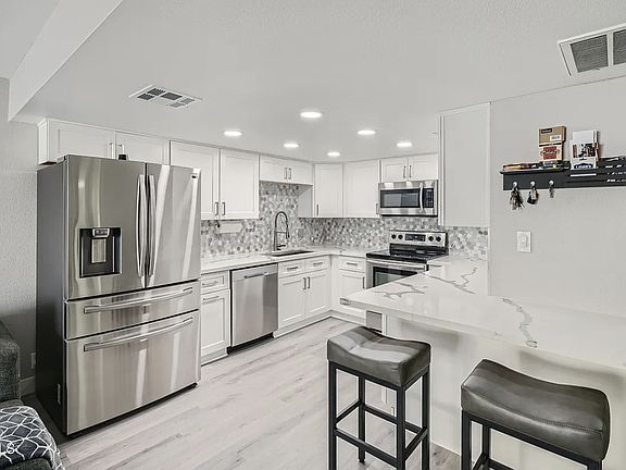 * New flooring and a remodeled kitchen equipped with stainless steel appliances, elegant quartz countertops and more.